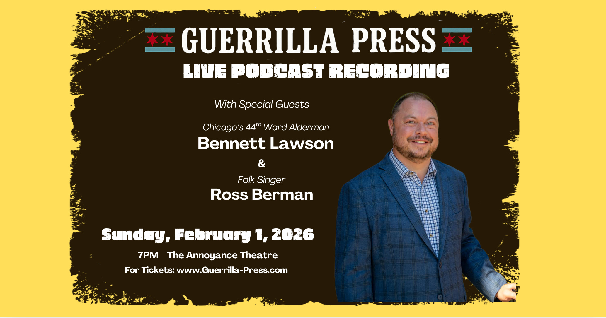 Chicago's 44th Ward Alderman, Indivisible Wrigleyville, and the folk city hustler will join Guerrilla Press this Sunday, February 1, at The Annoyance Theatre